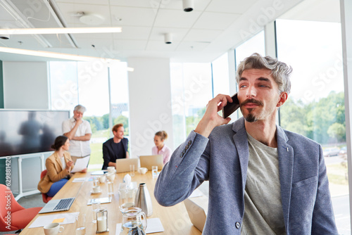 Confident male professional talking on mobile phone with team discussing in conference room at workplace