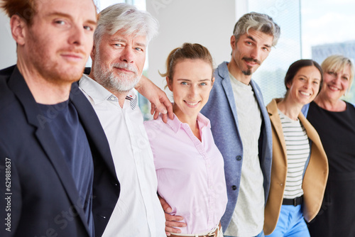 Portrait of smiling senior businessman standing with arms around colleagues at office