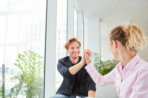 Happy businessman and businesswoman shaking hands while sitting together in office lounge