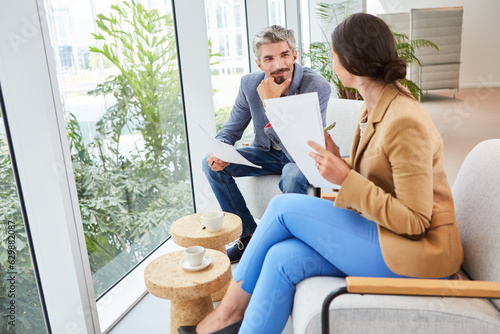 Businesswoman discussing over documents with businessman while sitting together in lounge