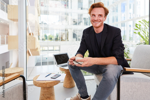 Smiling redhead businessman sitting with coffee cup in office lounge
