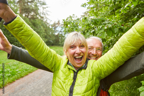 Happy elderly couple wearing jackets hiking in forest