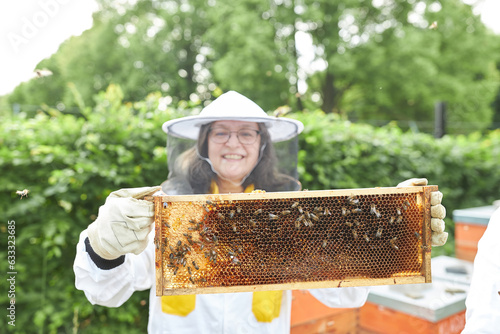 Happy senior female beekeeper examining beehive with honey bees