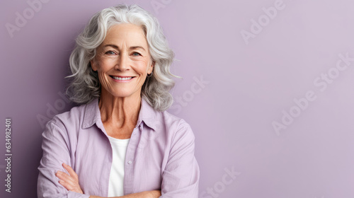 Buoyant woman in her 60s with silver hair against pale blue backdrop