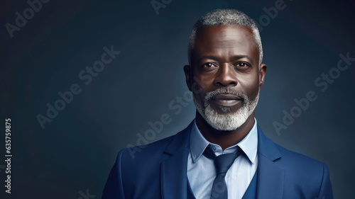 African businessman in 50s, gray hair, dark blue theme