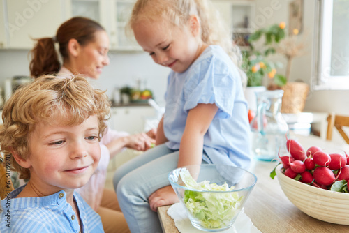 Smiling boy with mother and daughter preparing salad