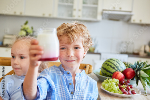 Smiling brother holding parfait jar with sister