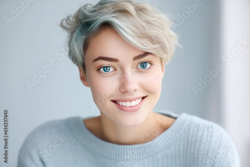 Young female with short hair smiling, grey background