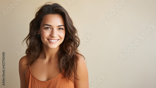 Smiling Middle Eastern woman in her 30s with long wavy hair posing against a beige background