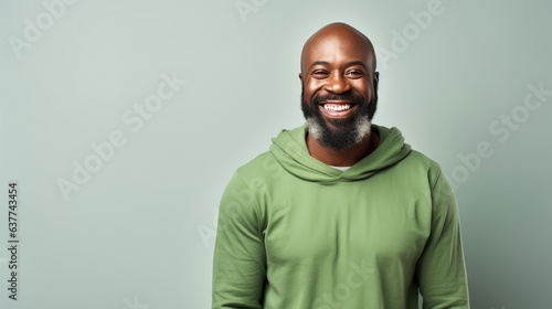 Cheerful Nigerian man in 40s, bald, green hoodie