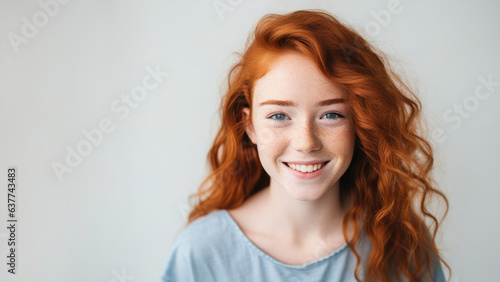 Smiling Irish girl with freckles and red hair in a casual blue top, exuding youthful joy and confidence