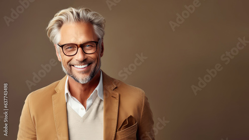 Confident European man in his 50s with medium blonde hair and glasses in a brown suit looking thoughtfully upwards