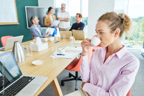 Contemplative female entrepreneur drinking coffee while staring at laptop near team discussing in conference room
