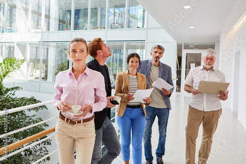 Confident businesswoman holding coffee cup with female and male colleagues discussing over documents in office corridor