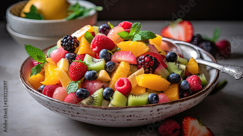 Vibrant fresh fruit salad with juicy berries and mint leaves on a plate