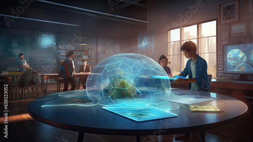 Young student experiencing virtual reality technology with a VR headset in a modern classroom for interactive learning and exploration.