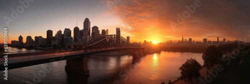 Panoramic cityscape at sunrise with a stunning skyline silhouette against a vibrant sky