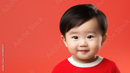 Adorable Japanese baby with soft black hair wearing a yellow top