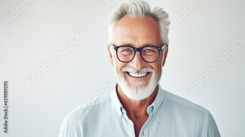 Portrait of a distinguished European man in his 70s with white hair and glasses, exuding confidence and wisdom
