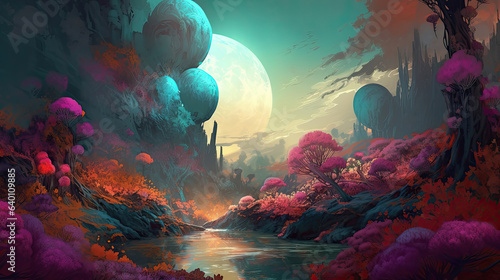 A mesmerizing ethereal landscape blending fantasy elements with vibrant colors and dreamlike trees under a magical sky, creating a serene and otherworldly atmosphere