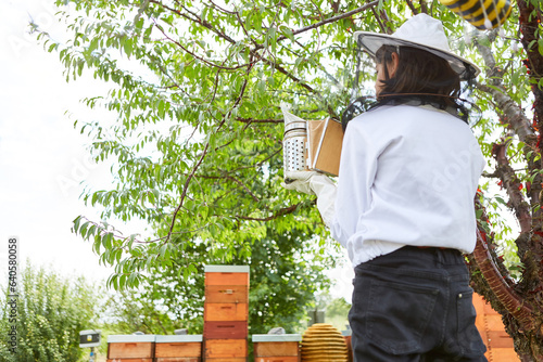 Girl holding smoker at beekeeping farm
