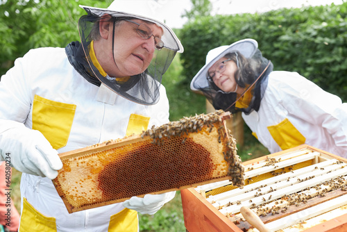 Smiling female apiarist by male beekeeper holding honeycomb frame