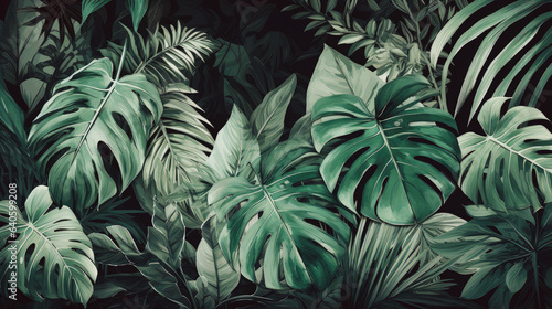 Lush tropical foliage background featuring vibrant monstera leaves and other green plants
