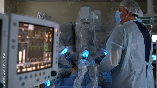 Medical equipment and monitors in background. Robotic surgery in sterile environment. Surgeon controls robot with multiple arms and performs surgical procedure. #644444423