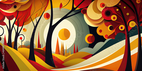 Abstract contemporary art collage with vibrant geometric shapes and colors creating a dynamic and visually stimulating composition on a clean white background.