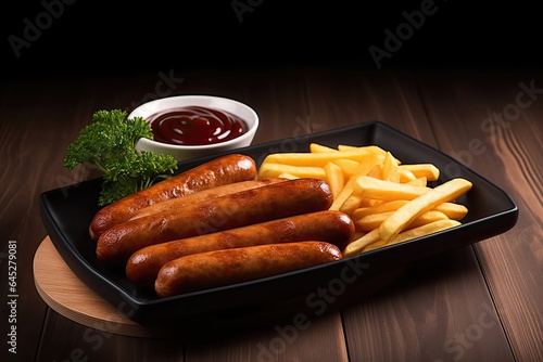 Grilled steak with french fries, fresh salad and tomatoes on a plate