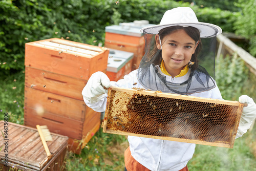 Portrait of girl holding honeycomb frame with honey bees