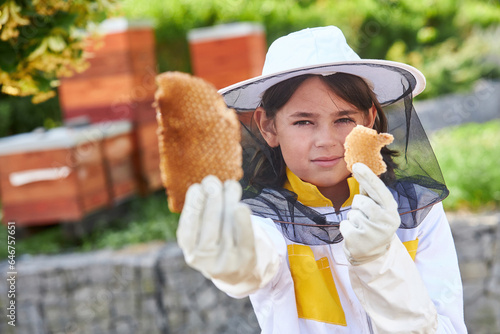 Girl analyzing honeycomb at apiary garden