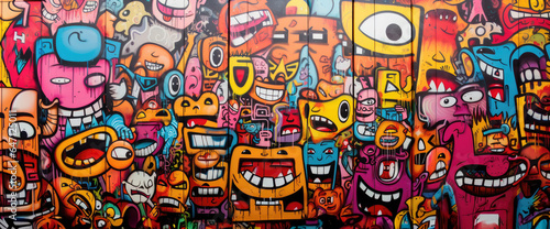 Graffiti wall with whimsical cartoon faces