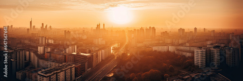 Dramatic panorama of cloudy sky during sunset over urban rooftops