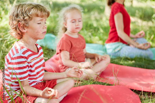 Boy and girl doing yoga at park