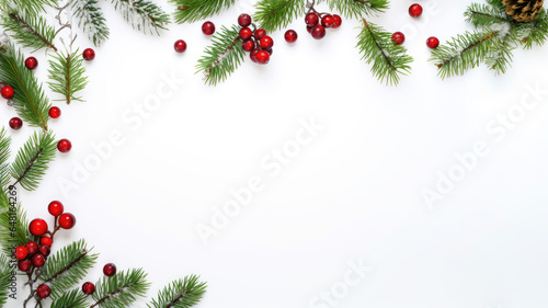 Festive arrangement with pine branches, cones, and red berries for Christmas.
