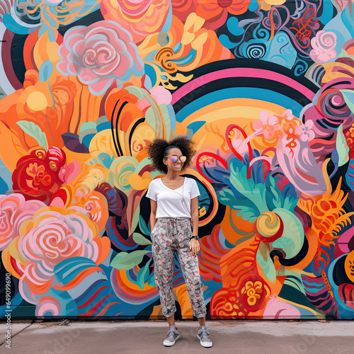 Hispanic woman in front of floral graffiti mural