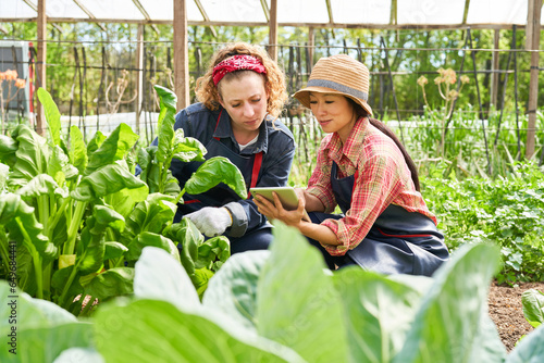 Male and female multiracial farmers discussing over tablet PC at greenhouse