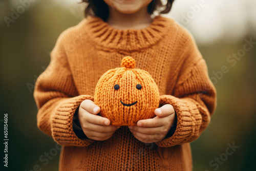 Happy child holding glowing jack-o-lantern pumpkin for Halloween