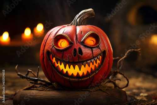 Glowing carved Halloween pumpkin in a dark eerie setting
