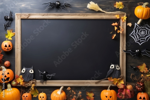 Blank chalkboard with jack-o-lantern pumpkins as Halloween decoration