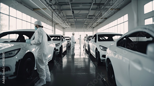 Futuristic sports car in a high-tech automotive plant with robots