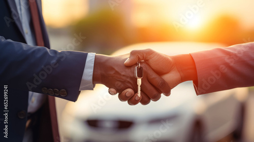 Buyer and salesman giving handshake with keys after car sale