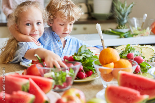 Happy siblings near table with fruits and vegetables at home