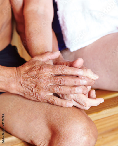 Zwei Senioren halten Hände in Sauna
