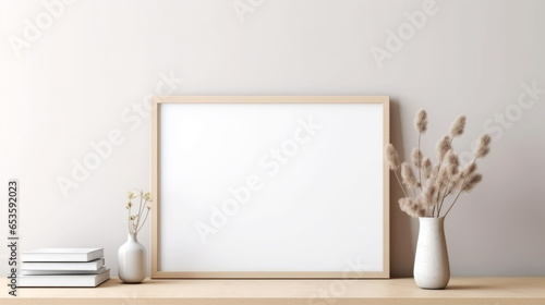 Minimalistic home decor with blank frame and flower vase on a wooden shelf