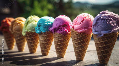 Assorted scoops of colorful ice cream in cones arranged in a row