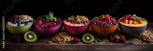 Top view of four fruit-filled smoothie bowls