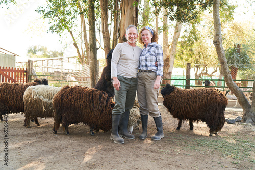 Smiling male and female farmers standing with sheep at farm