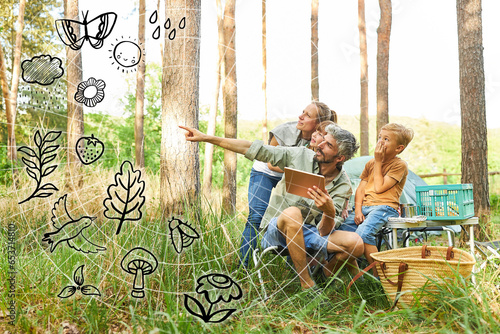 Vater zeigt Familie Natur im Wald mit Hilfe von digitaler Technologie
